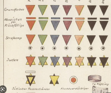 This accusation comes from the Roma and Sinti (South Asian) people, I honestly don't even know how to discuss this, because it seems to me a bit controlling to tell people that they can't claim a symbol because two groups that were part of that target consider you racist, or you consider their reappropriation racist, first of all because you are giving importance to a part of the target and not the other people who were also part of the target and want to reappropriate it, you are giving more voice to a group than to the other people who want to claim it. And no, they also said that "the only Afabs, disabled, neuro-diverse, etc. affected were the Roma and Sinti who had were that" really where did they get that from, mostly they assume that because in the English Wikipedia, it puts Roma and Sinti first; however, that Wikipedia does not say "were affected Roma and Sinti, who were afab, disabled, neurodivirgents, lesbians" that Wikipedia mentions each group affected, it does not say that all is groups were Roma or Sinti, besides that in the Spanish Wikipedia it does not even put Roma and Sinti first. We are not going to take as a primary rule the English Wikipedia eh, so those accusations don't make sense. In fact, until later a specific one, the brown triangle, began to be used for the rumanies.Antisemitic; Jews.